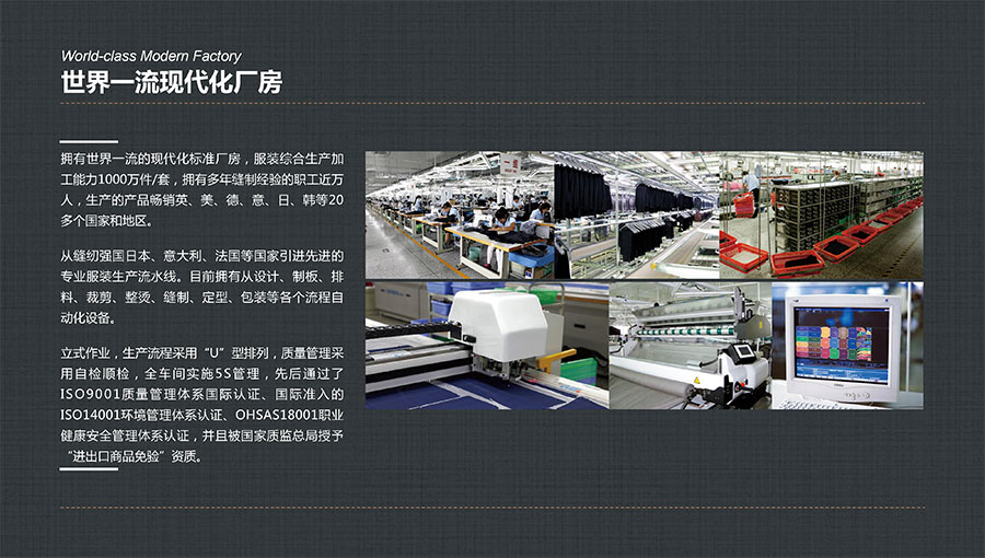 大楊集團(tuán)主要從事生產(chǎn)和銷售各類中高檔服裝產(chǎn)品,以西裝縫制享譽(yù)全球。年服裝綜合生產(chǎn)加工能力1100萬件/套,年西服出口量600萬件/套,年服裝定制產(chǎn)量200萬件/套,連續(xù)多年排名全國第一,是全球重要的西裝生產(chǎn)基地。