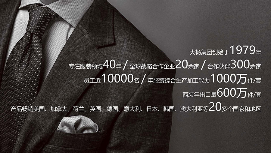 目前,大楊集團(tuán)全球營銷網(wǎng)絡(luò)已遍布美國、加拿大、荷蘭、英國、澳大利亞及日本等27個(gè)國家和地區(qū),開設(shè)單裁合作店面上千家,與加拿大互聯(lián)網(wǎng)定制巨頭Indochino公司、澳大利亞知名男裝定制企業(yè)Institchu公司、美國服裝巨頭TBI公司簽署戰(zhàn)略合作協(xié)議,年定制產(chǎn)品數(shù)量已突破200萬件/套,具備西裝、襯衫、休閑裝以及大衣、風(fēng)衣等全品類定制生產(chǎn)能力。