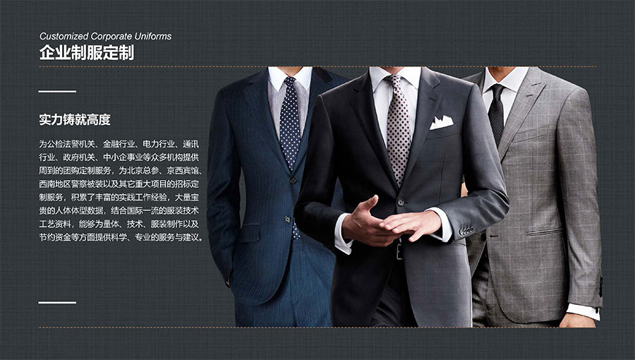 凱門品牌(KEYYMEN):高級職業(yè)裝品牌,企業(yè)形象定制專家。以精湛工藝及最優(yōu)性價比打造高品質(zhì)、個性時尚的企業(yè)形象,專屬于那些為理想、為事業(yè)打拼,并在成功過程中享受生活的職場團隊及精英人士。