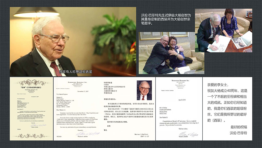 大楊集團堅持做民族品牌,揚國人志氣,致力打造國際一流服裝品牌。上世紀90年代創(chuàng)立了第一個自主品牌——TRANDS(創(chuàng)世),先后榮獲“中國出口名牌”、“中國名牌產(chǎn)品”等稱號,并獲得中國服裝協(xié)會頒發(fā)的中國服裝品牌品質(zhì)大獎,成為當今中國高級男裝的領軍品牌之一。TRANDS(創(chuàng)世)品牌申報國家非遺創(chuàng)新產(chǎn)品的“‘龍’金絲蘇繡中式華服”被授予十大類紡織創(chuàng)新產(chǎn)品。“股神”沃倫·巴菲特、微軟主席比爾·蓋茨、世界經(jīng)濟論壇主席克勞斯·施瓦布等國際精英人士,均已成為品牌的忠實客戶。目前,大楊集團已形成以高級男裝品牌TRANDS(創(chuàng)世)為龍頭,團體定制高級商務裝品牌KEYMEN(凱門)、高級定制品牌凱門定制、網(wǎng)上直銷品牌YOUSOKU(優(yōu)·搜·酷)、學生裝品牌KEYMEN KIDS等組成的自主品牌梯隊。