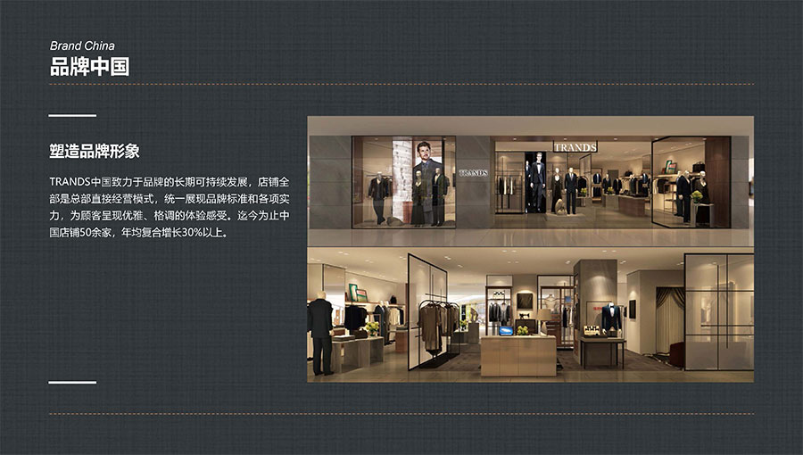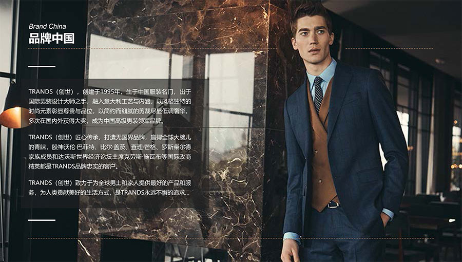 創(chuàng)世品牌(TRANDS):創(chuàng)建于1995年,是當今中國高級男裝的代表品牌之一。TRANDS創(chuàng)世成衣產(chǎn)品及量身定制的西裝以其至臻品質(zhì)和精湛工藝,贏得眾多國際政商精英多年來的青睞。