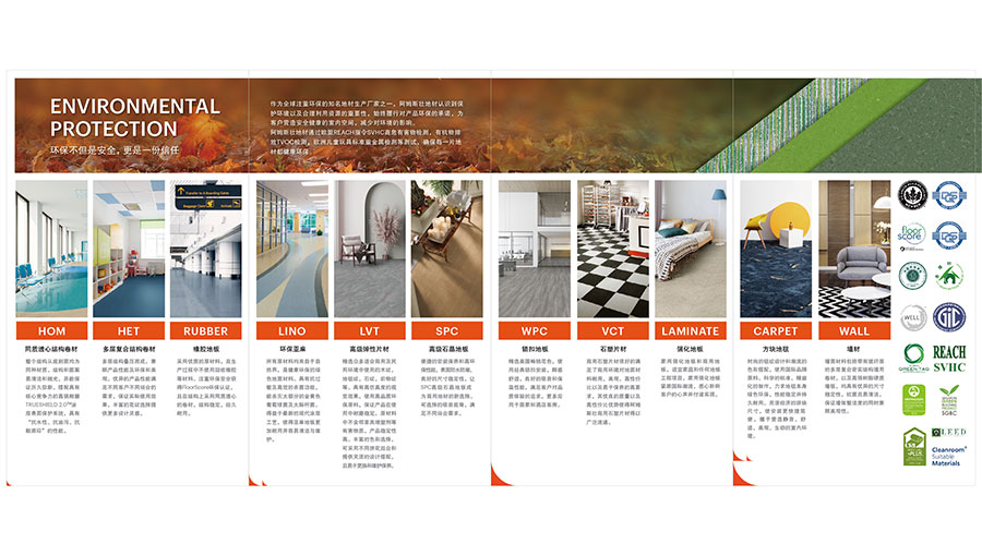 主要產(chǎn)品:阿姆斯壯地材(PVC-FREE塑型環(huán)保橡膠、RUBBER橡膠地板、HOM同質(zhì)透心結(jié)構(gòu)卷材、HET多層復(fù)合結(jié)構(gòu)卷材、SPORTS運(yùn)動(dòng)地板、LVT高級(jí)彈性片材、SPC高級(jí)石晶地板、WPC鎖扣地板、VCT&LAMINATE石塑片材&強(qiáng)化地板、CARPET方塊地毯、WALL墻材)