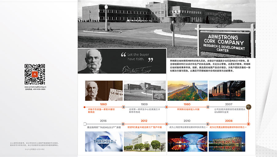 阿姆斯壯品牌創(chuàng)始于1860年,至今已有165年的悠久歷史,是一家“全球領(lǐng)先的地面與墻面材料系統(tǒng)解決方案提供商”。阿姆斯壯1980年進(jìn)入中國(guó)市場(chǎng),于2012年投資超兩億美金,在蘇州與湖州建立高標(biāo)準(zhǔn)地材工廠,一直致力于設(shè)計(jì)研發(fā)和生產(chǎn)銷(xiāo)售高品質(zhì)彈性地材、地毯、墻材等產(chǎn)品,應(yīng)用領(lǐng)域涵蓋輕商業(yè)、酒店、醫(yī)養(yǎng)、辦公、教育、文體等多個(gè)領(lǐng)域。