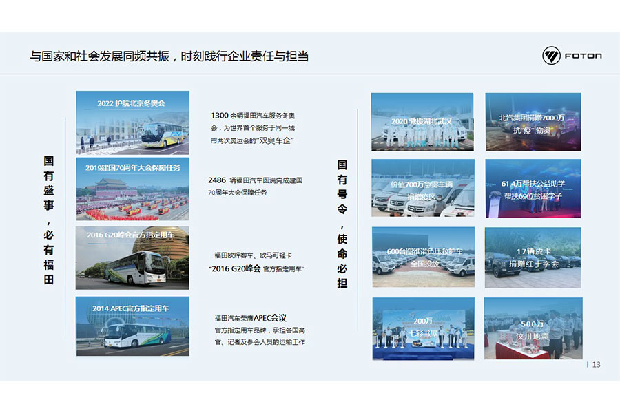 在快速發(fā)展中,北汽福田時(shí)刻踐行企業(yè)責(zé)任,與國家和社會(huì)發(fā)展同頻共振。北汽福田積極參與國際峰會(huì)賽事與國家重大活動(dòng),在新中國成立70周年慶典、“一帶一路”國際合作高峰論壇、G20峰會(huì)、APEC會(huì)議、慶祝中國共產(chǎn)黨成立100周年等重大活動(dòng)中承擔(dān)重要任務(wù),并以綠色科技實(shí)力助力北京奧運(yùn)會(huì)、平昌冬奧會(huì)等國際賽事。在全球積極促進(jìn)社會(huì)可持續(xù)發(fā)展,面對(duì)新冠疫情、抗震救災(zāi)、屬地就業(yè)、教育醫(yī)療、自然環(huán)保等領(lǐng)域履行承諾,北汽福田累計(jì)投入車輛及物資數(shù)億元,時(shí)刻踐行企業(yè)擔(dān)當(dāng)。