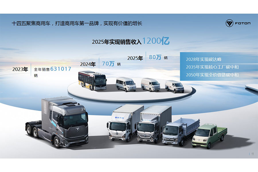 “十四五”期間,北汽福田持續(xù)聚焦商用車,深化打造商用車第一品牌,實(shí)現(xiàn)有價(jià)值的增長。2023年北汽福田實(shí)現(xiàn)銷售631017輛,穩(wěn)步保持行業(yè)前列地位。2024年銷售目標(biāo)是70萬輛,到2025年實(shí)現(xiàn)整車銷售80萬輛,銷售收入1200億元。